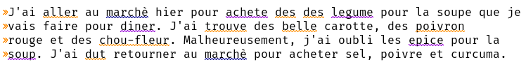 Les mots soulignés en violet correspondent à des fautes d’orthographe, en bleu à des doublons et ceux soulignés en orange des fautes de grammaire. Attention certaines fautes ne sont pas détectées.
